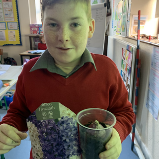 We learned the parts of a bulb. We bisected a hyacinth bulb to investigate the inside of the bulb. We planted 2 hyacinth bulbs in water and left 1 in daylight and the other in darkness. We will observe the differences until they bloom. We also planted the bisected hyacinth in clay to see if it will grow and we can compare it to the hyacinth bulb in clay that has not been bisected.